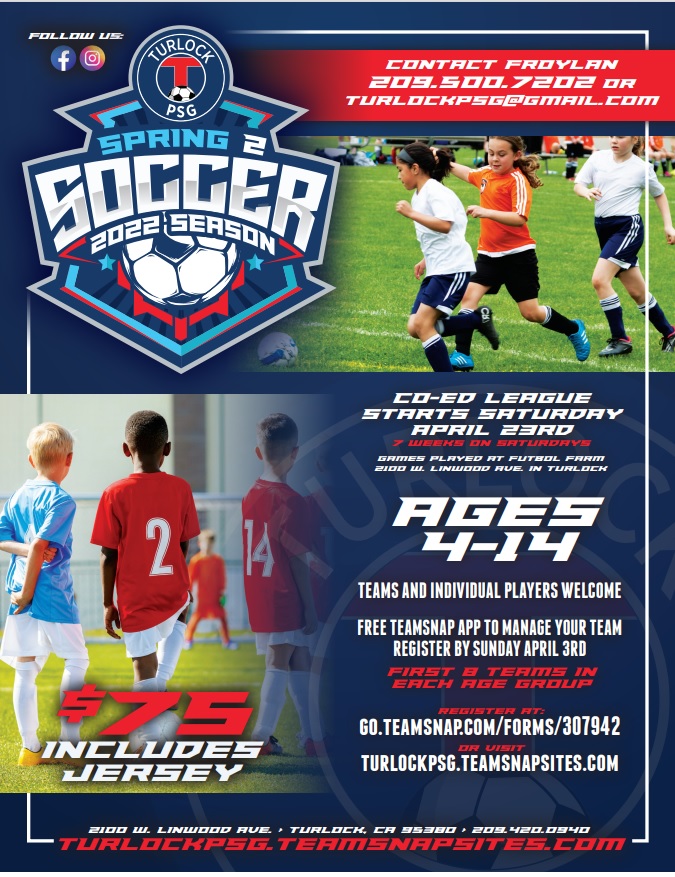 Register For Spring 2 2022 Recreation League Now! Starts Saturday April 23 Location: The Futbol Farm (2100 W. Linwood Ave. in Turlock). Only $75/player! And includes a jersey! Click here to register online: https://go.teamsnap.com/forms/307942.